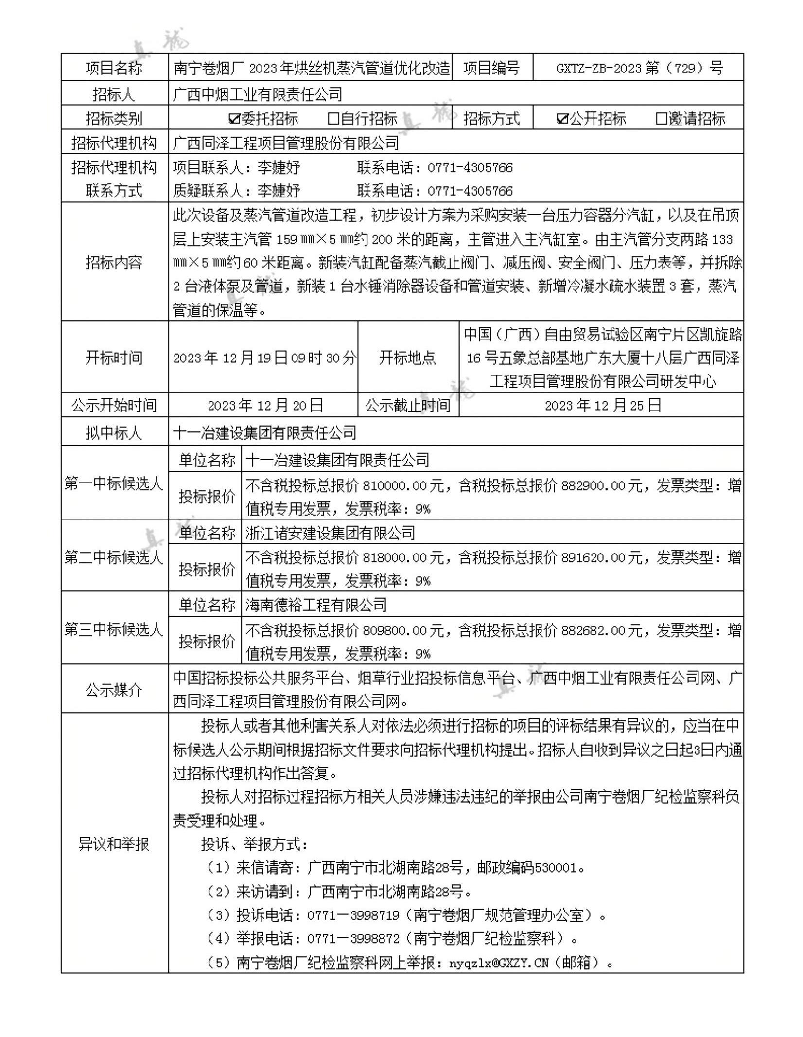 廣西中煙工業(yè)有限責(zé)任公司南寧卷煙廠2023年烘絲機(jī)蒸汽管道優(yōu)化改造(項目編號:GXTZ-ZB-2023第(729)號)中標(biāo)候選人公示