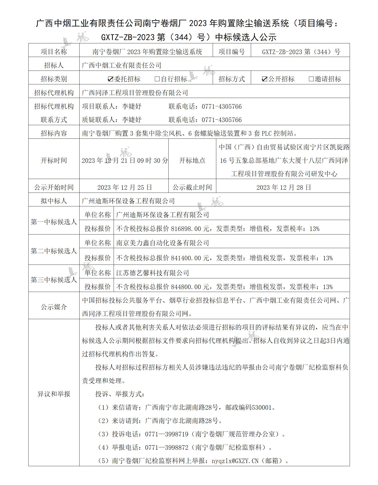 廣西中煙工業(yè)有限責(zé)任公司南寧卷煙廠2023年購置除塵輸送系統(tǒng)(項(xiàng)目編號(hào):GXTZ-ZB-2023第(344)號(hào))中標(biāo)候選人公示