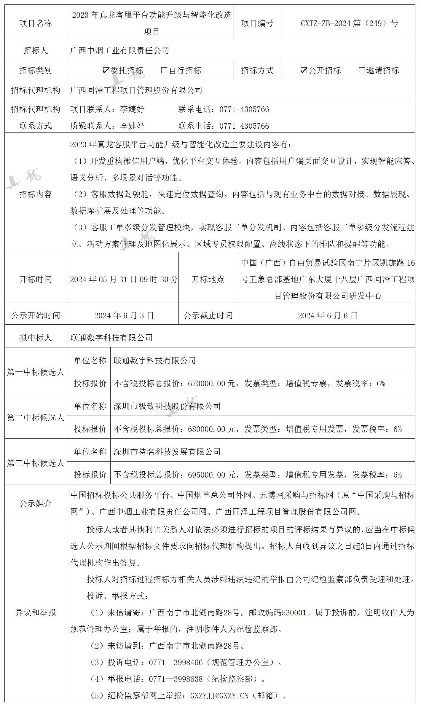 廣西中煙工業(yè)有限責(zé)任公司2023年真龍客服平臺功能升級與智能化改造項(xiàng)目(項(xiàng)目編號:GXTZ-ZB-2024第(249)號)中標(biāo)候選人公示