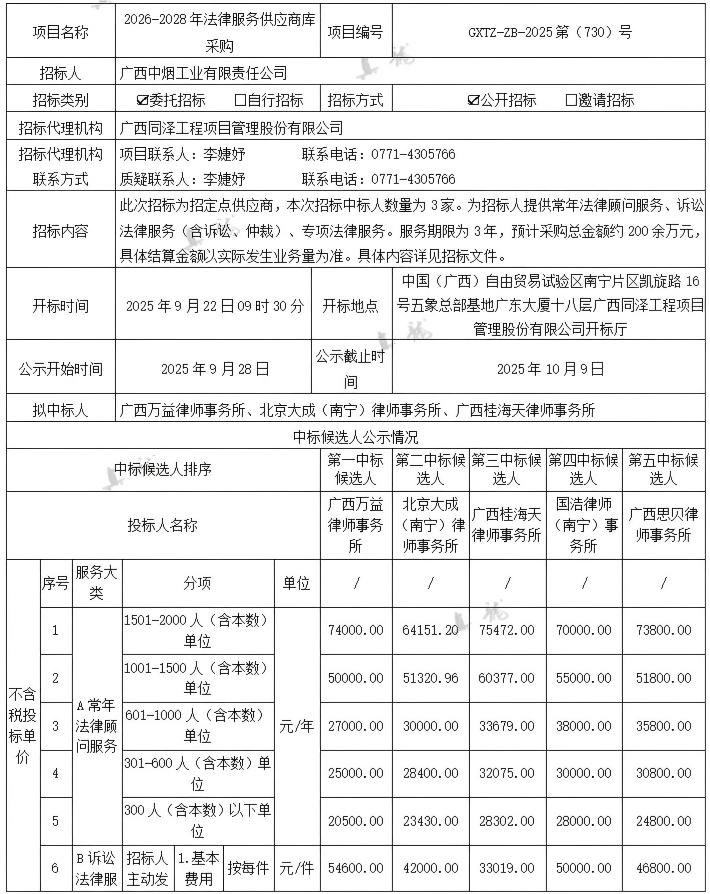 廣西中煙工業(yè)有限責(zé)任公司2026-2028年法律服務(wù)供應(yīng)商庫采購(項(xiàng)目編號:GXTZ-ZB-2025第(730)號)中標(biāo)候選人公示