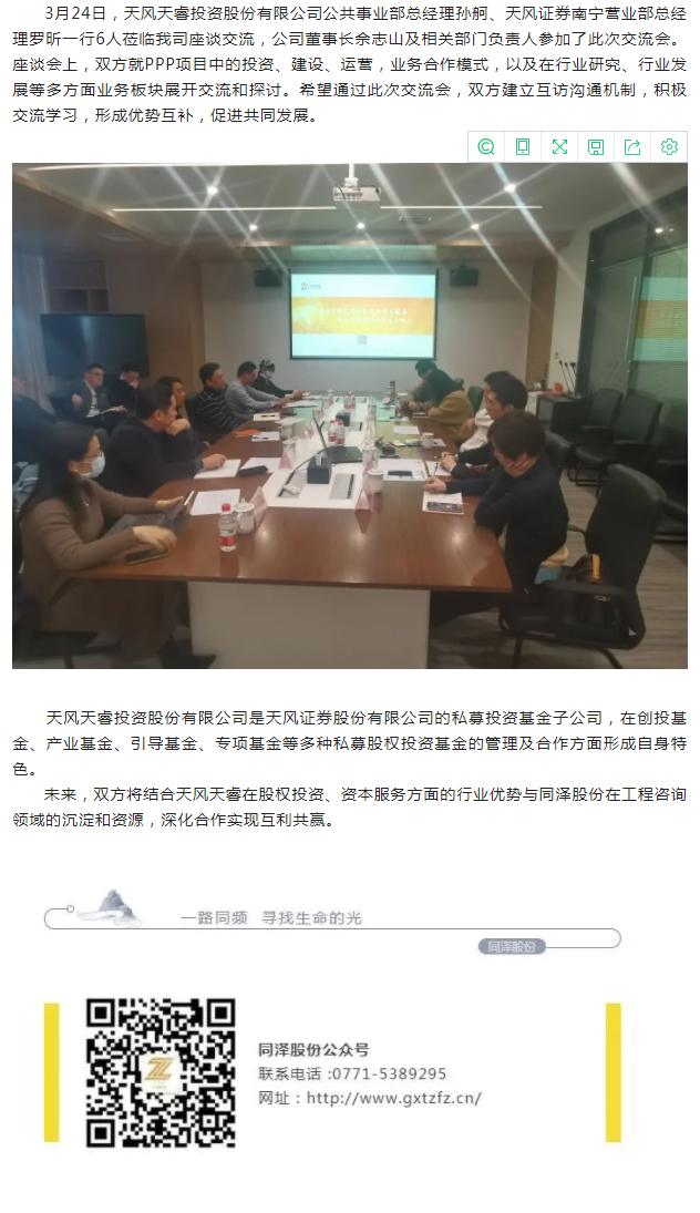 合作交流 | 天風天睿投資股份有限公司到訪同澤股份座談交流